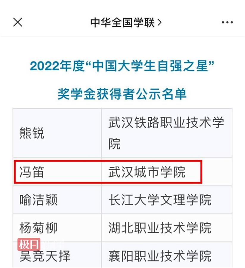 近日,2022年度“中国大学生自强之星”奖学金获得者名单揭晓,武汉城市学院学子冯笛荣获2022年度“中国大学生自强之星”奖学金。这是该院第四名获此殊荣的学生。