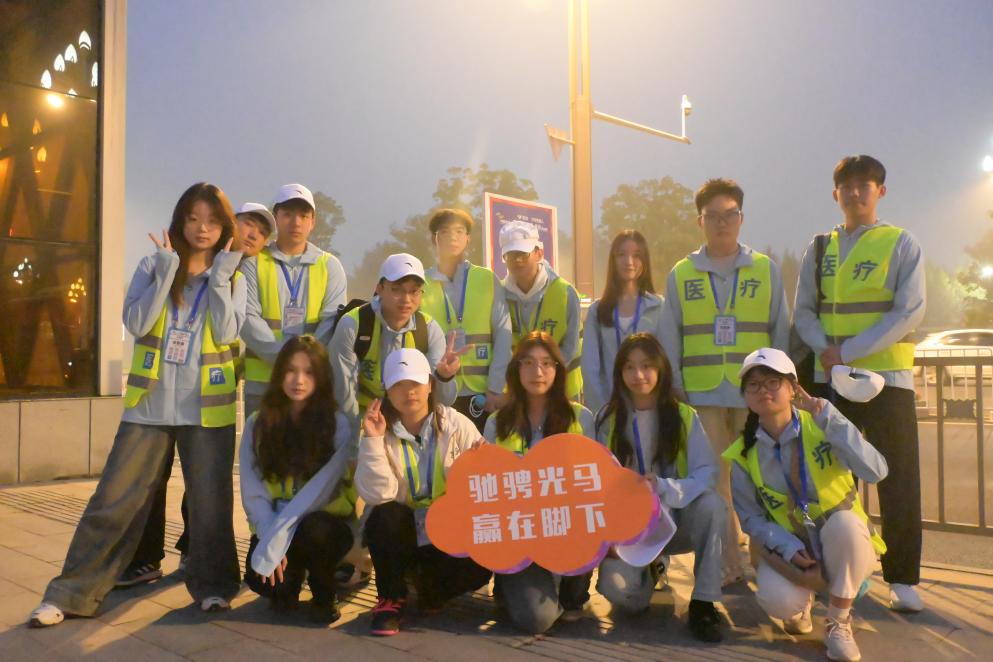 天未亮时,所有准备工作全部完成,志愿者们在小组长的组织下到达指定点位。在近15公里的服务赛段中,每隔50米便会出现我院身着反光衣的医疗志愿者,如青松般笔直伫立在道路一旁待命,以应对紧急情况。我院外语学部2022级商务英语1班志愿者莫燕说:“这是我第一次做为志愿者来参加马拉松活动,我满怀期待,想尽全力做到最好!”