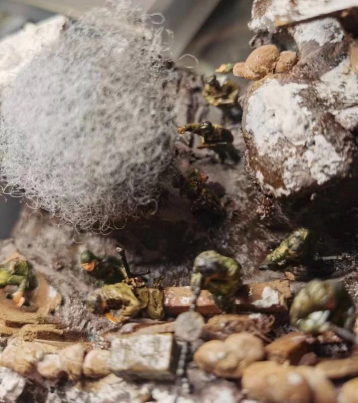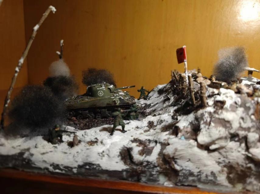 其实制作这个微缩模型的过程并非一帆风顺,材料的简陋,工具的缺失,都是仲骁辰想要制作一个理想作品的阻碍。但是他并没有因为这些阻碍而退缩,相反他不断地去查找各方资料,了解每种材料的性质,对比每种材料的价格,寻找昂贵材料的代替品,尽量减少材料对成品的影响。最后,他用自己所拥有的工具和最具性价比的材料建造出了这个虽不完美但却是用尽全部努力的微缩模型。他如此的坚持,就是希望能够真实地复原 “长津湖战役”的场景,让大家能够透过这个微缩模型看到73年前的影子,从而更加了解这段历史。