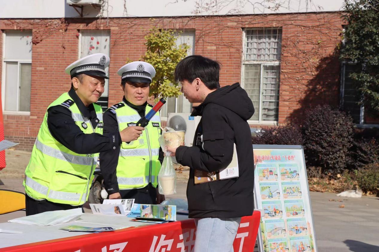 活动分为现场宣传和教育讲座两部分。9时30分,代少武一行在我院南教学楼前广场为师生普及安全知识,并现场教学酒精测试仪的实时操作方法。