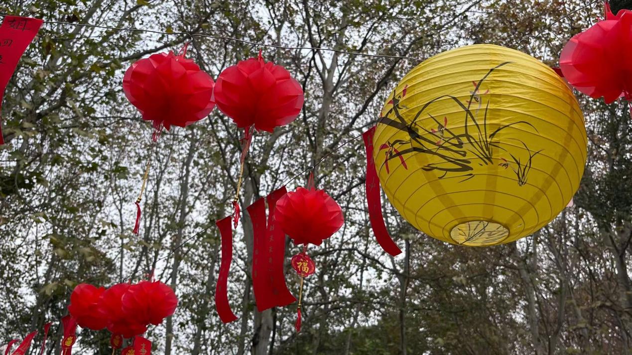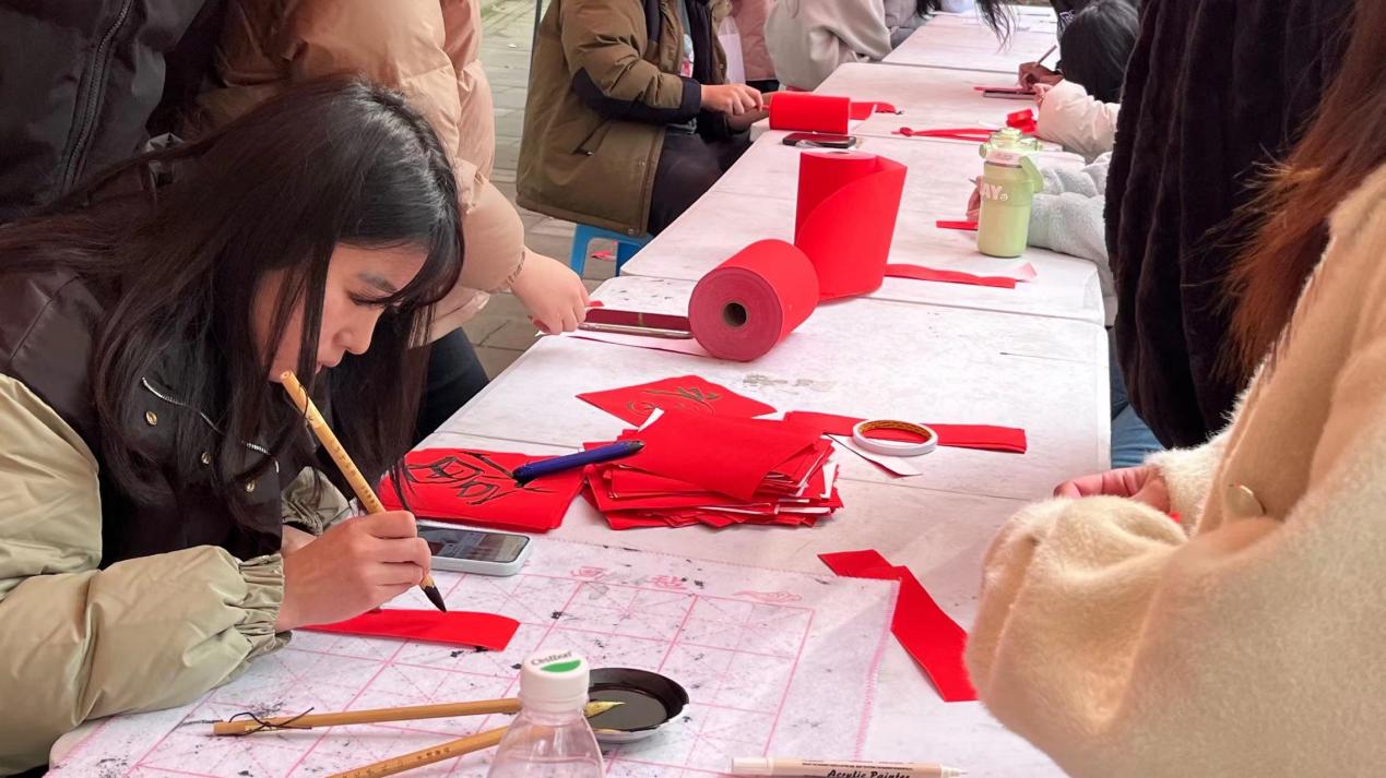 在新年祈福活动中,学生们手写祈福及新年愿望,并将它们挂在红绳上,迎接新一年的好运气。“一夜暴富”“逢考必过”“万事顺利”,各种祝愿在社团成员的帮助下挂满了红绳,抬头望去,春日的欢喜尽收眼底。
