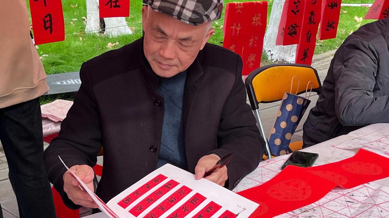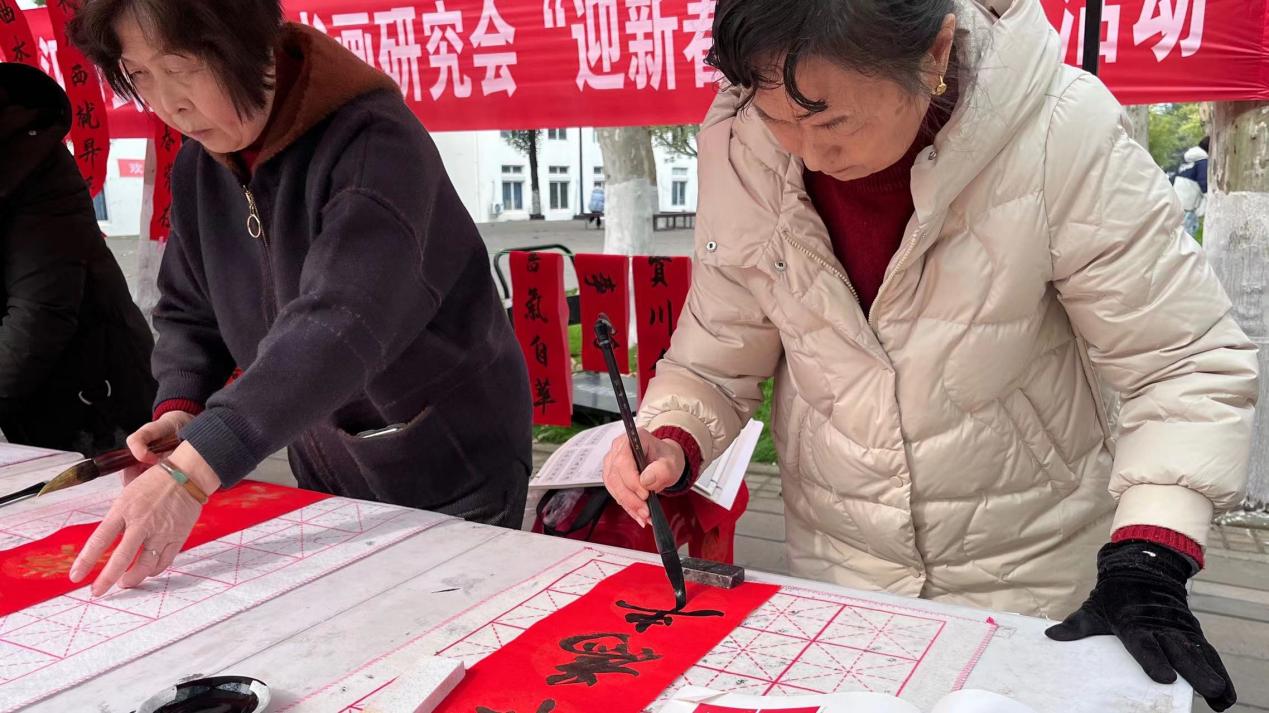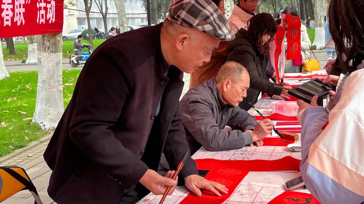 在学院团委邀请下,武汉市武昌区南湖书画协会与我院墨溢东湖书画协会顺利连线,“迎新春,送春暖”的春联书写活动正式拉开序幕。在此次书法交流活动中,南湖书画协会的老前辈们成为本次活动的亮点。在猜灯谜活动正式开始前,就已有不少围观者准备看前辈们大显身手,社团成员们准备好了纸、笔和墨汁,供前辈们使用,他们挥毫泼墨,手法娴熟。吸引了众多热爱书法的学生参与,现场气氛热烈。