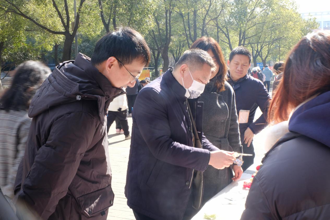 肖军仔细欣赏学生们的作品,询问摊位“主理人”作品成本和售价,为学生们的学习成果和态度点赞。
