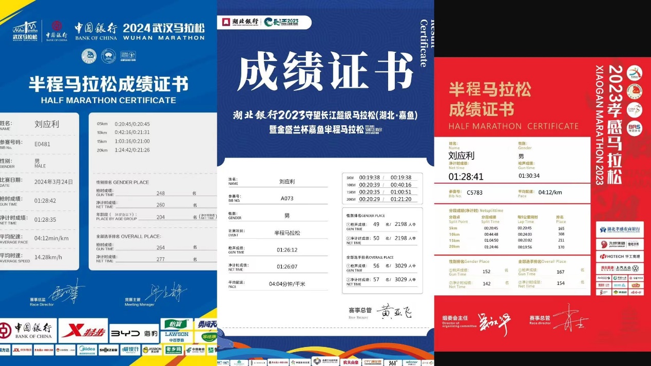 刘应利从小喜欢运动,在大二期间开始接触中长跑,从那时起,跑步便成为了他的日常。通过不断地努力和坚持,他不仅在学校的运动会上屡获佳绩,还多次参加半程马拉松比赛,并获得了证书。