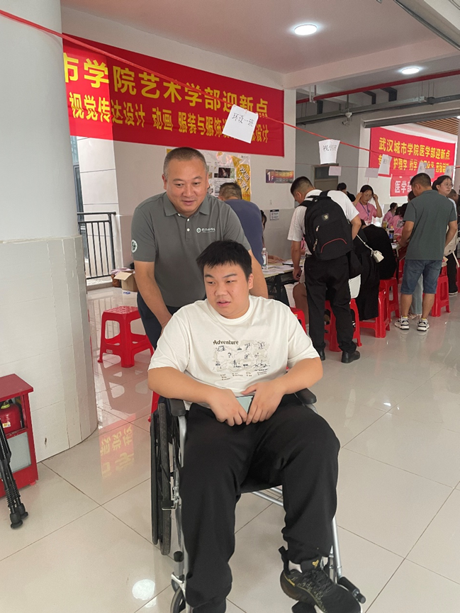 校园内人潮涌动,热闹非凡。后勤保卫处的廖处长偶然间目睹了这一幕,连忙上前帮忙推轮椅,并全程陪同等待,直到刘孜恒的父母忙完。这一温馨场景,不仅是对刘孜恒个人的关怀,更是对全体新生无声的承诺——在这里,每一个学生都将得到来自学校的温暖与支持。