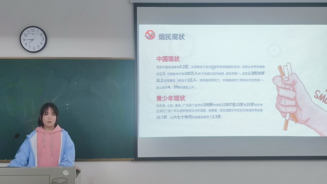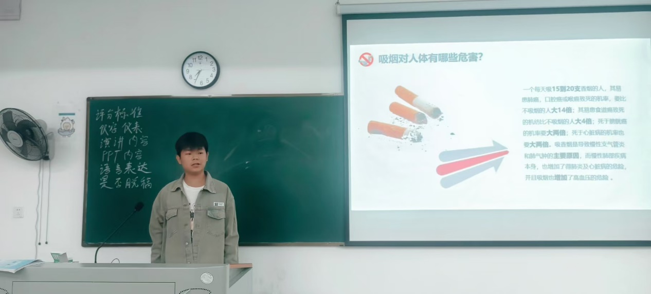 活动现场,同学们围绕禁烟主题,从不同角度深入剖析了吸烟对个人健康、校园环境和社会发展的危害。有的选手从个人经历出发,分享了家人或朋友因吸烟而遭受的健康问题;有的则从科学研究入手,阐述了吸烟对身体健康的长期影响;还有的从校园环境和社会责任的角度,讨论了禁烟对于创建和谐校园、树立良好社会风气的积极作用。同学们的演讲内容丰富多彩,用生动的案例、深刻的见解和激情四溢的演讲,向在场的学生们们传达了禁烟的重要性。