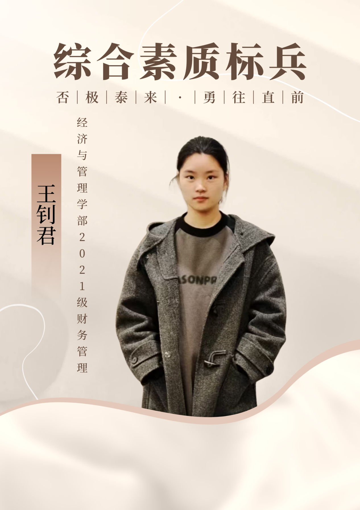 个人名片:王钊君,经济与管理学部2021级财务管理2班的杰出学子,中共预备党员,以其出色的表现荣获2023-2024学年“综合素质标兵”称号。