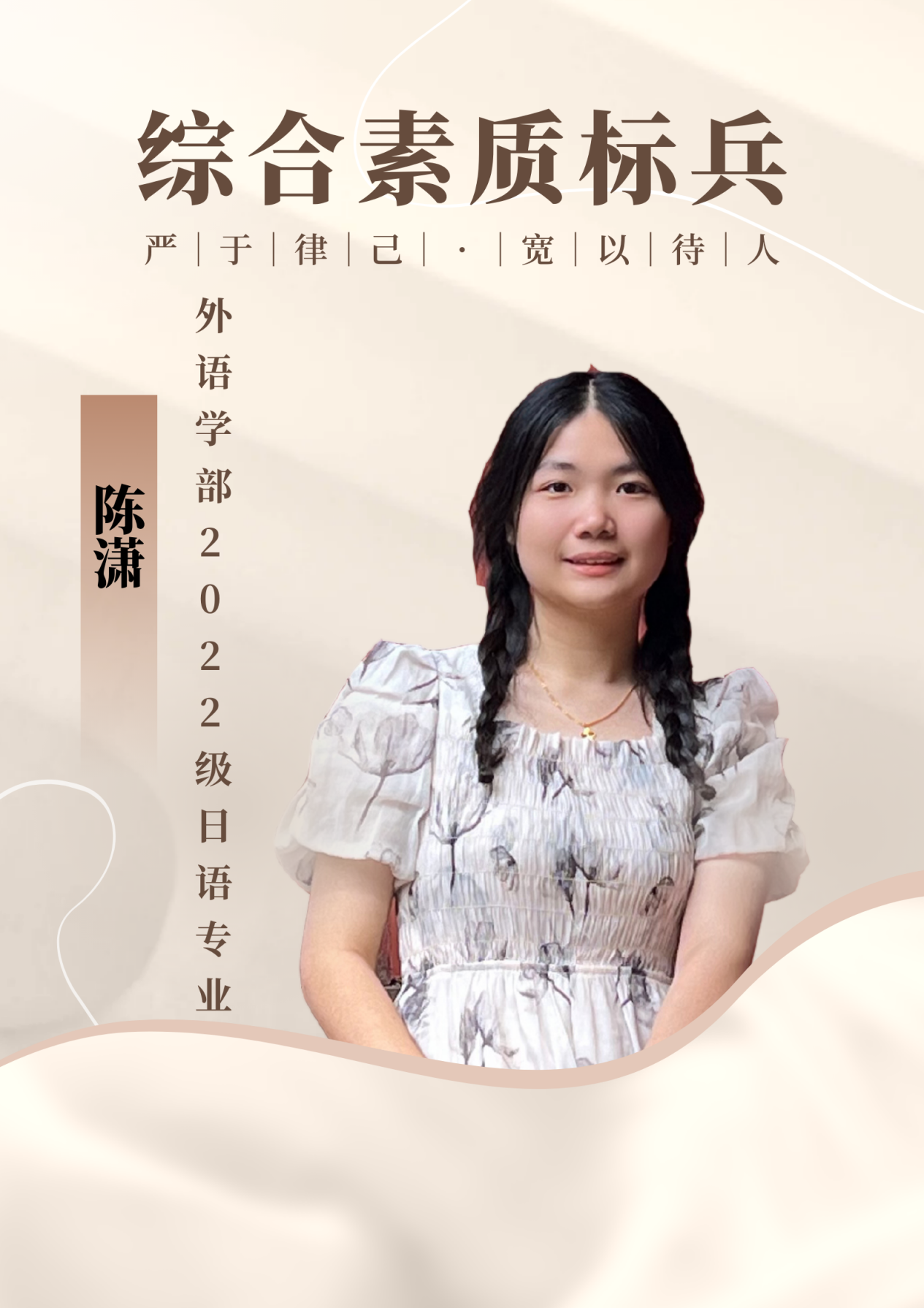 个人名片:陈潇,外语学部2022级日语一班学生,入党积极分子,2023-2024学年获得“综合素质标兵”称号。