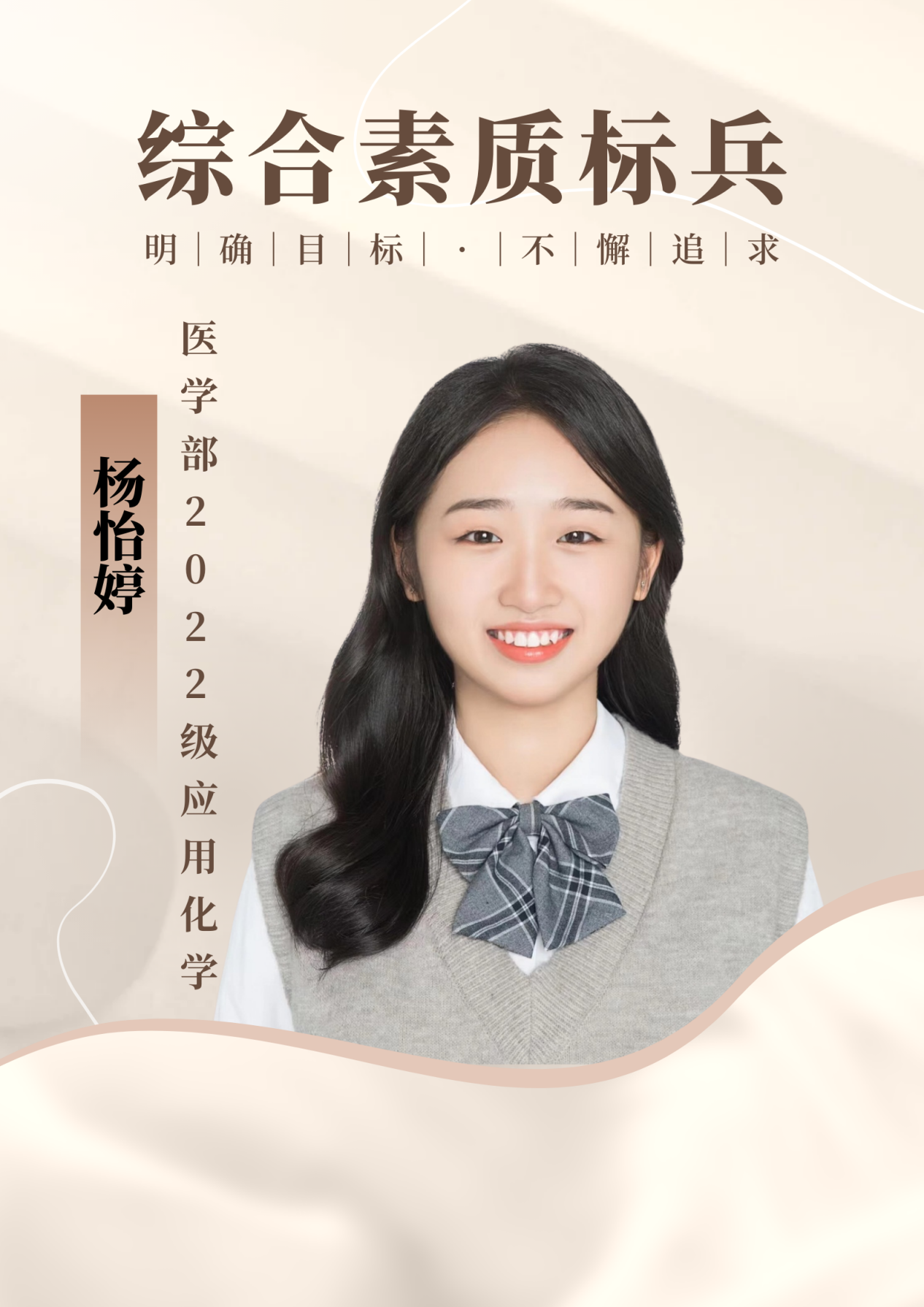 个人名片:杨怡婷,医学部2022级应用化学1班的杰出学子,预备党员,博学于文,践之于行,明确目标,不懈追求,以其出色的表现荣获2023-2024学年“综合素质标兵”称号。