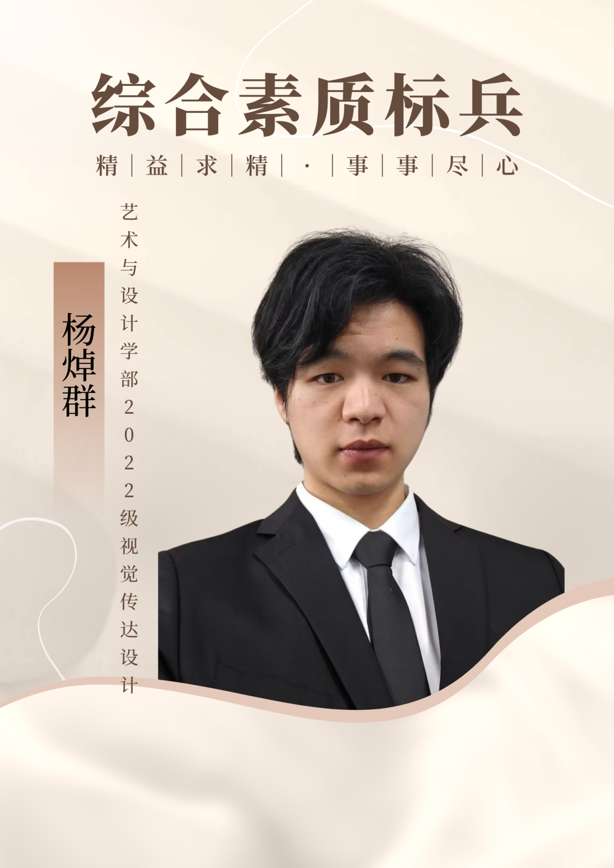 个人名片:杨焯群,22级艺术与设计学部视觉传达设计专业, 2023-2024学年获得“综合素质标兵”称号。