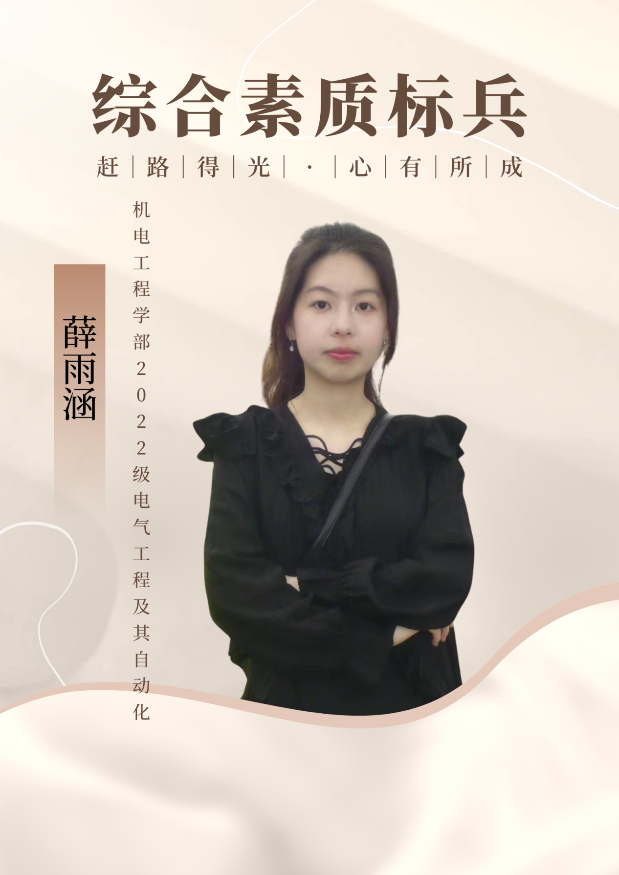 个人名片:薛雨涵,机电工程学部22级电气工程及其自动化2班学生,2023-2024学年综合素质标兵,担任第十五届机电学部分团委学生组织秘书处副部长,第十六届机电学部分团委学生组织主席。