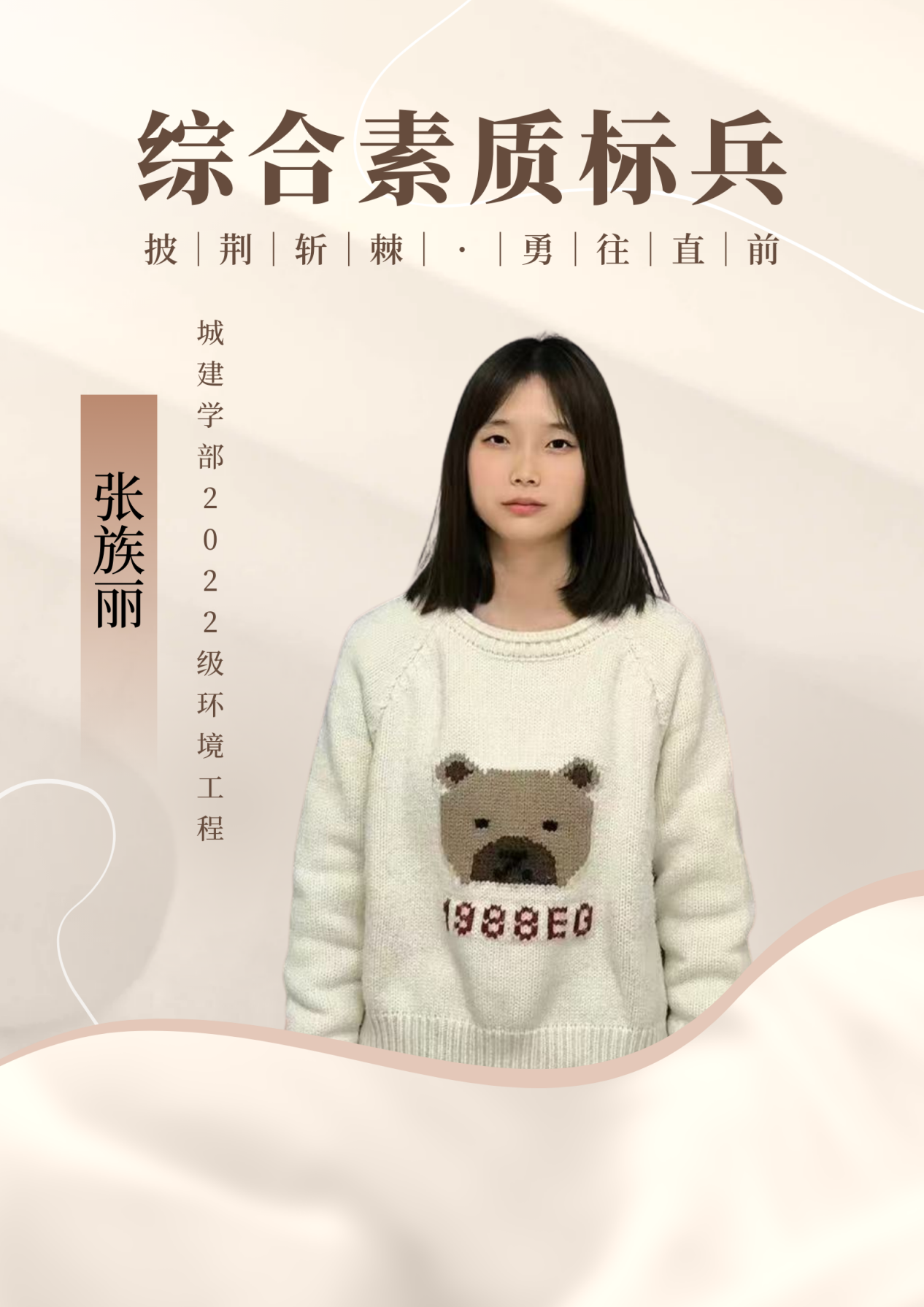 个人名片:张族丽,城建学部,2022级环境工程一班团支书,获得2023-2024学年综合素质标兵称号。