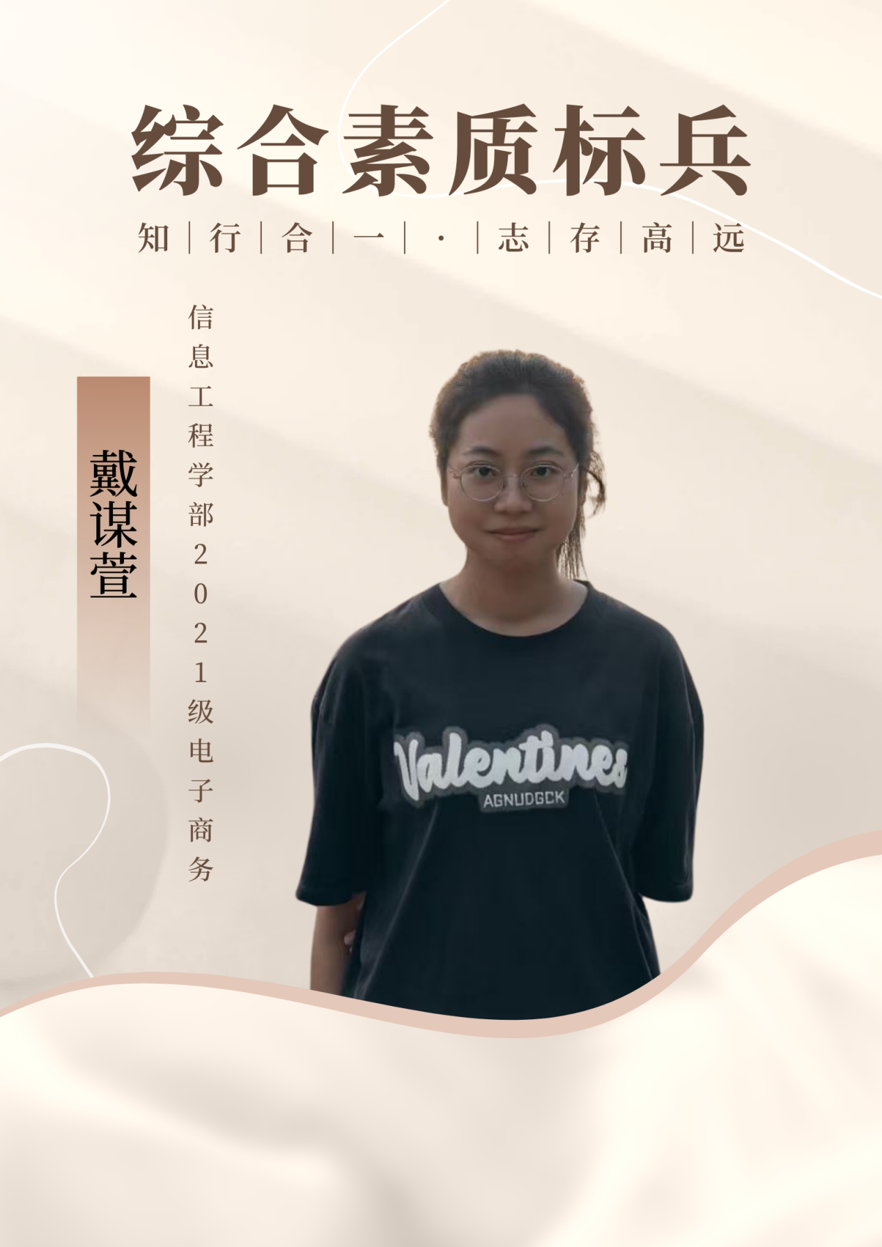 个人名片:戴谋萱,信息工程学部2021级电子商务2班的杰出学子,知行合一,志存高远。以其出色的表现荣获2023-2024学年“综合素质标兵”称号。