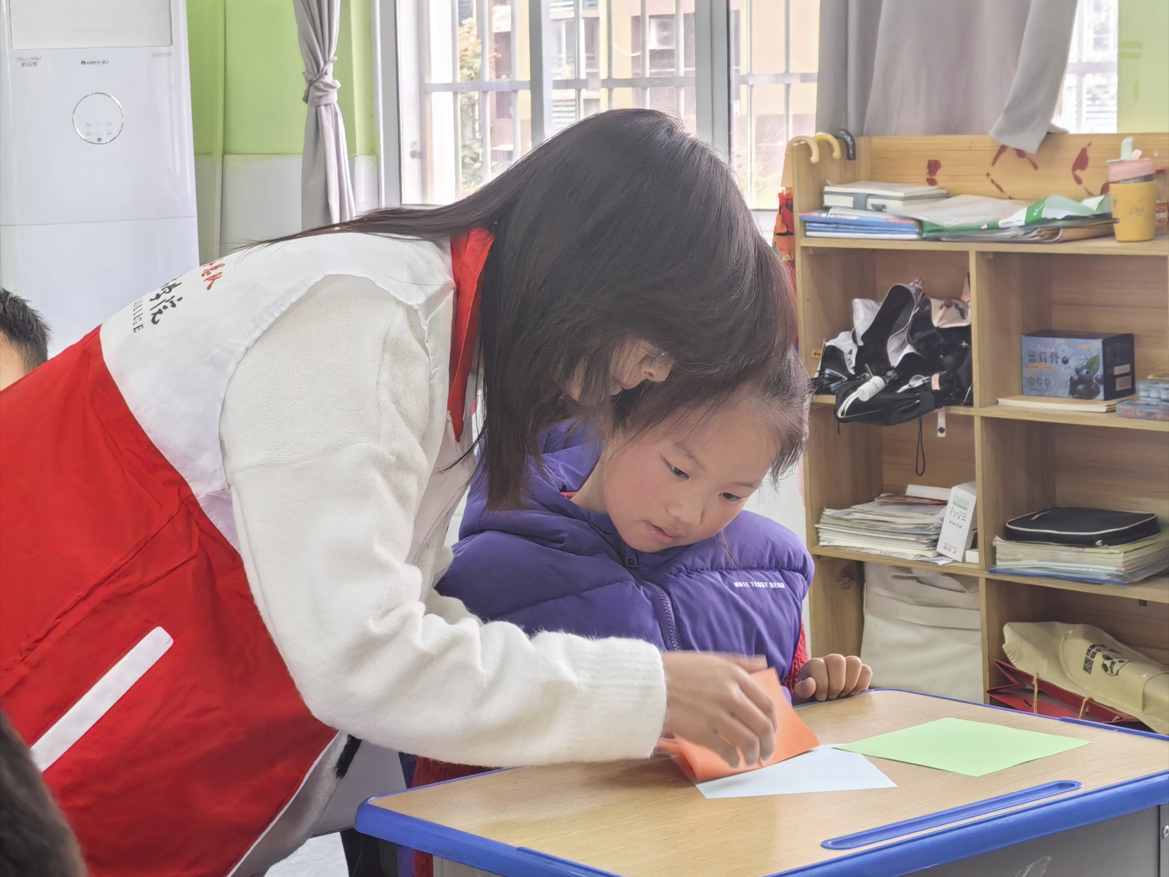 活动现场,志愿者们身着统一的服装,带着精心准备的折纸材料走进了长林实验小学的教室。他们首先通过生动的讲解和示范,向小朋友们展示了折纸艺术的魅力——从简单的纸飞机到复杂的千纸鹤,每一步都蕴含着无限的创意与乐趣。在志愿者的悉心指导下,小朋友们纷纷动手尝试,一张张普通的纸章在他们的手中逐渐变成了形态各异的艺术品,教室里也充满了他们的欢声笑语。