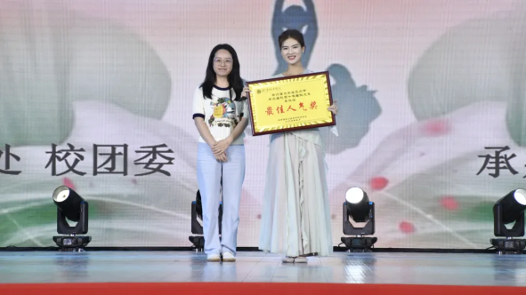 武汉工商学院大学生美育中心副主任李璐瑶为经济与管理学部颁发最佳人气奖