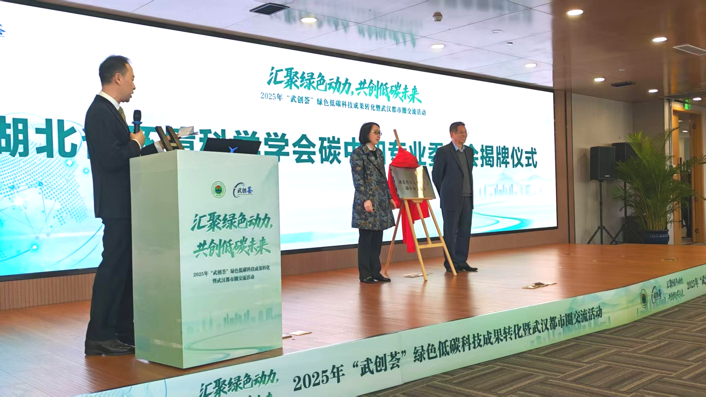 活动现场各环节紧密衔接、重点突出。刘秋新教授以湖北省环境科学学会监事长身份,与武汉双碳产业研究院副院长梁胜文共同为 “湖北省环境科学学会碳中和专业委员会” 成立揭牌。这一揭牌仪式标志着湖北省在碳中和领域学术研究与产业实践协同发展迈出重要一步,也为武汉都市圈生态环境领域科技交流与合作搭建了新的平台。刘秋新教授长期深耕环境保护与碳中和相关领域教学科研工作,此次参与揭牌仪式,充分体现了我校在绿色低碳人才培养与科研领域的影响力。