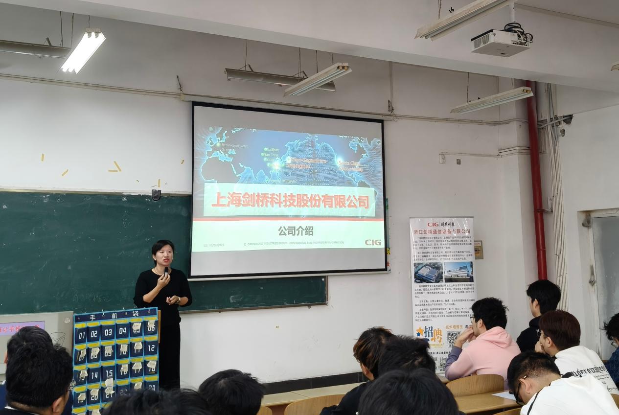 距离宣讲会开始还有一段时间,南四302教室内聚集了不少手持简历、早早守候的同学,现场气氛热烈。上海剑桥科技股份有限公司的专场招聘宣讲会如期开启。企业代表朱雪莲详细介绍了公司今年的招聘计划,清晰阐述了各个岗位的数量、职责以及发展前景。她强调,通过英语四级或六级的同学在应聘时将被优先考虑,以适配海外业务沟通需求。