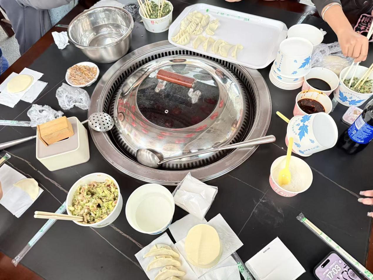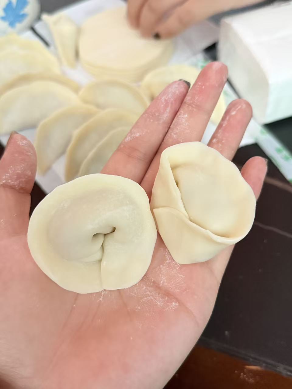 “左手托住皮,右手从边缘往中间捏,力度要均匀”。面对这些食材,同学们都不知从何下手。工作人员耐心地在各桌间穿梭指导,手把手教同学们调整馅料用量、掌握捏褶技巧。“馅料别放太满,不然煮的时候容易破”。此起彼伏的交谈声,让整个活动现场暖意融融。同学们认真聆听,跃跃欲试。从生疏到熟练,从“露馅包子”到“元宝满盘”。