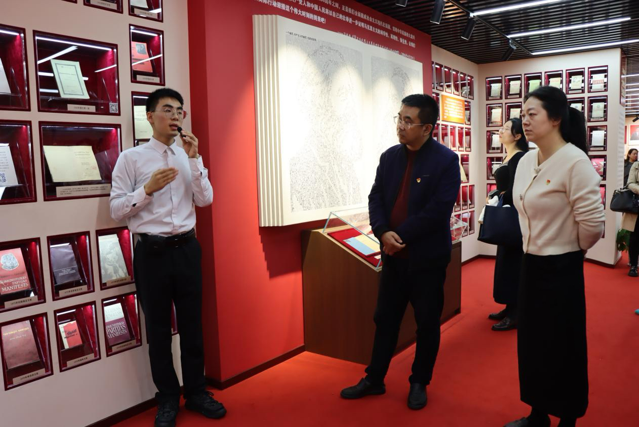 当目光聚焦于《共产党宣言》《资本论》等马克思主义经典著作的珍贵范本时,支部成员神情尤为专注,有的俯身细读展品说明,有的用手机记录关键内容,有的结合自身工作实际与理论学习心得展开小声交流——机关党总支第一党支部党员们立足行政管理岗位特点,围绕“如何将马克思主义立场观点方法融入日常工作”分享思考,入党积极分子也主动请教理论疑点,现场学习氛围浓厚而热烈,充分展现了支部成员求真务实的学习态度与积极向党的思想自觉。