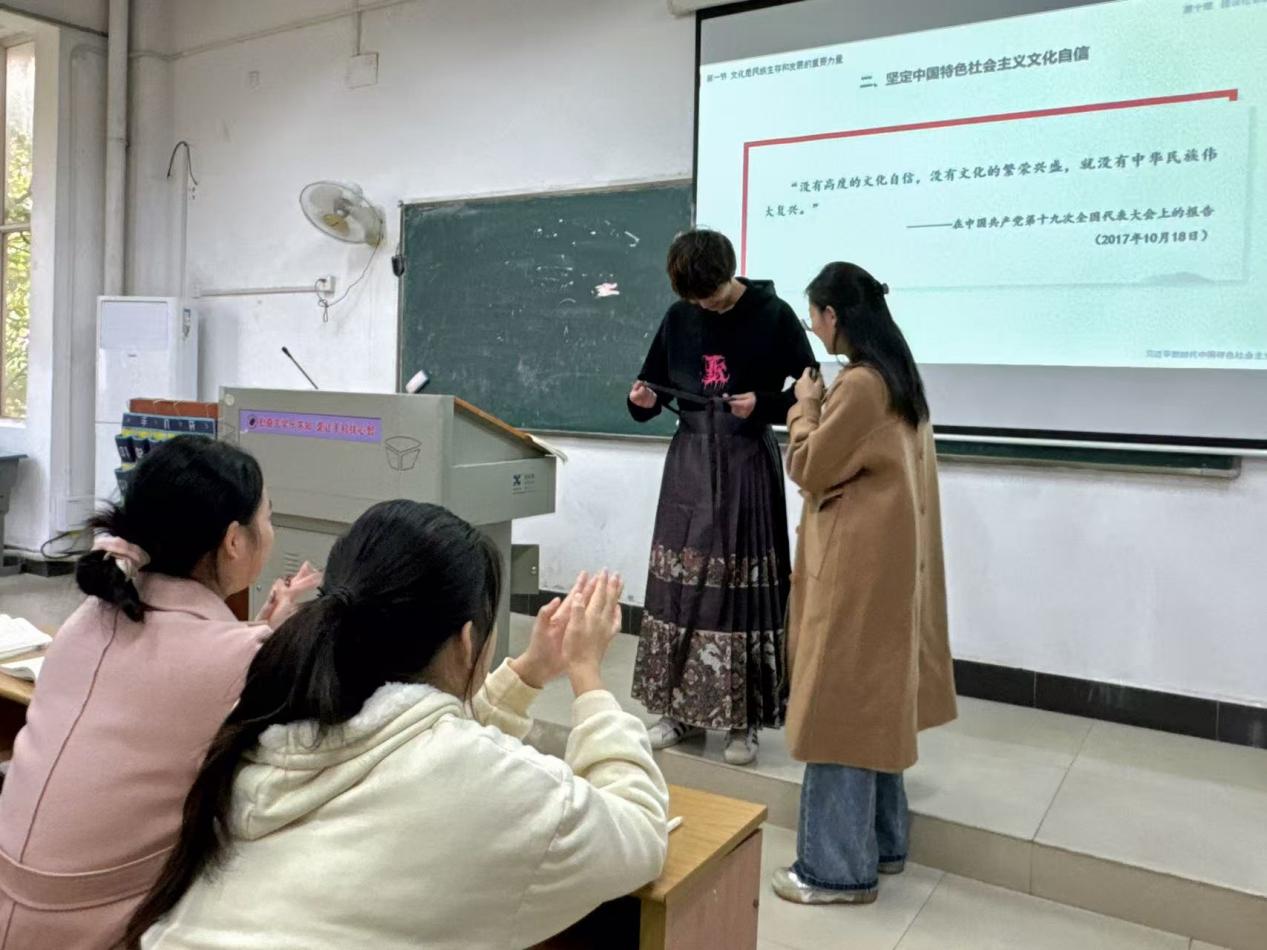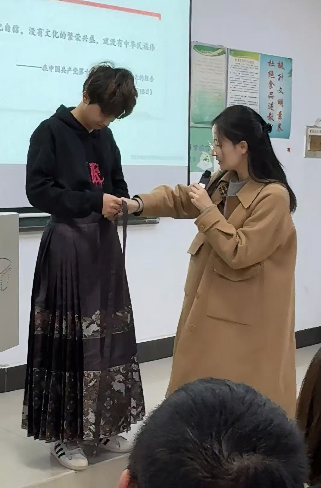 “讲解‘建设社会主义文化强国’这一章时,我一直想打破理论教学的枯燥感。” 梁老师说,比起在 PPT 上罗列文字,让同学们亲手触摸马面裙的面料、看清百褶的工艺,才能真正理解 “传统不是静止的标本,而是活在当下的生活”,让 “文化强国” 从抽象概念变成可触碰的真实体验。