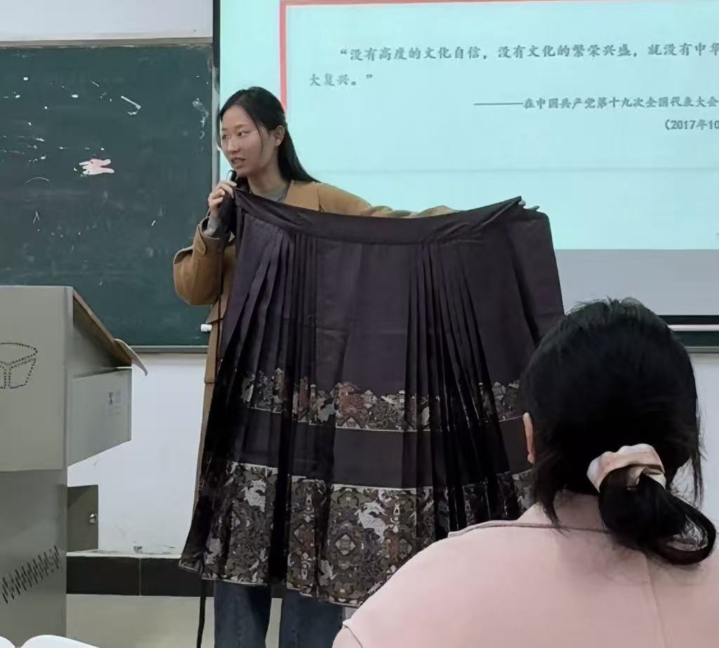 新闻网讯(高级记者 唐欣 洪菲霞)近日,在南6103教室,我校梁鸽老师将珍藏的马面裙带入习概课堂,举办了一场特别的传统服饰展示会,让 “文化自信” 从抽象概念变得可感可触。