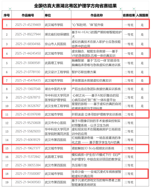 新闻网讯(通讯员 邱莹)近日,2025年全国仿真创新应用大赛湖北赛区(护理学方向)赛事结果正式揭晓,我校医学部师生凭借扎实的专业功底与创新的实践能力脱颖而出,在与众多顶尖医疗机构及高校的同台竞技中斩获颇丰,共夺得2个一等奖、2个二等奖、2个三等奖,其中3项作品成功入围全国总决赛,充分展现了学部在护理学专业教学与实践创新领域的坚实实力。