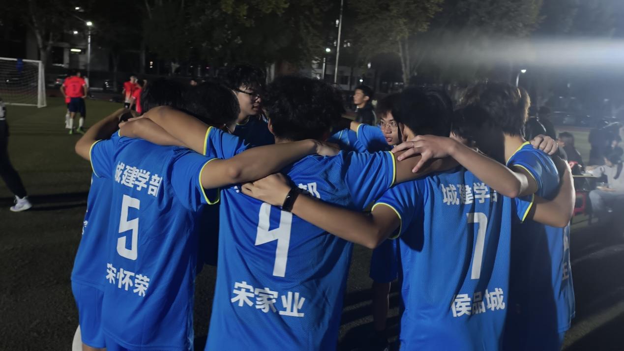 场边呐喊声瞬间沸腾,整个赛场被热烈气氛席卷。城建队员们并未沉浸喜悦,当即呼喊队友回防坚守,直至终场哨声响起,队员们才真正松一口气。赛后大家围在一起拍肩鼓劲,互相总结经验、打气加油,展现出不气馁、不服输的体育风采。经济与管理学部24级会计五班陈旭业表示“我们在全场40分钟里每一位队员都在竭尽自己的最大努力,为了胜利拼搏,哪怕是在最后一分钟被对手绝杀,我们依然在互相鼓励,总结不足,为下一场比赛做好充足准备”