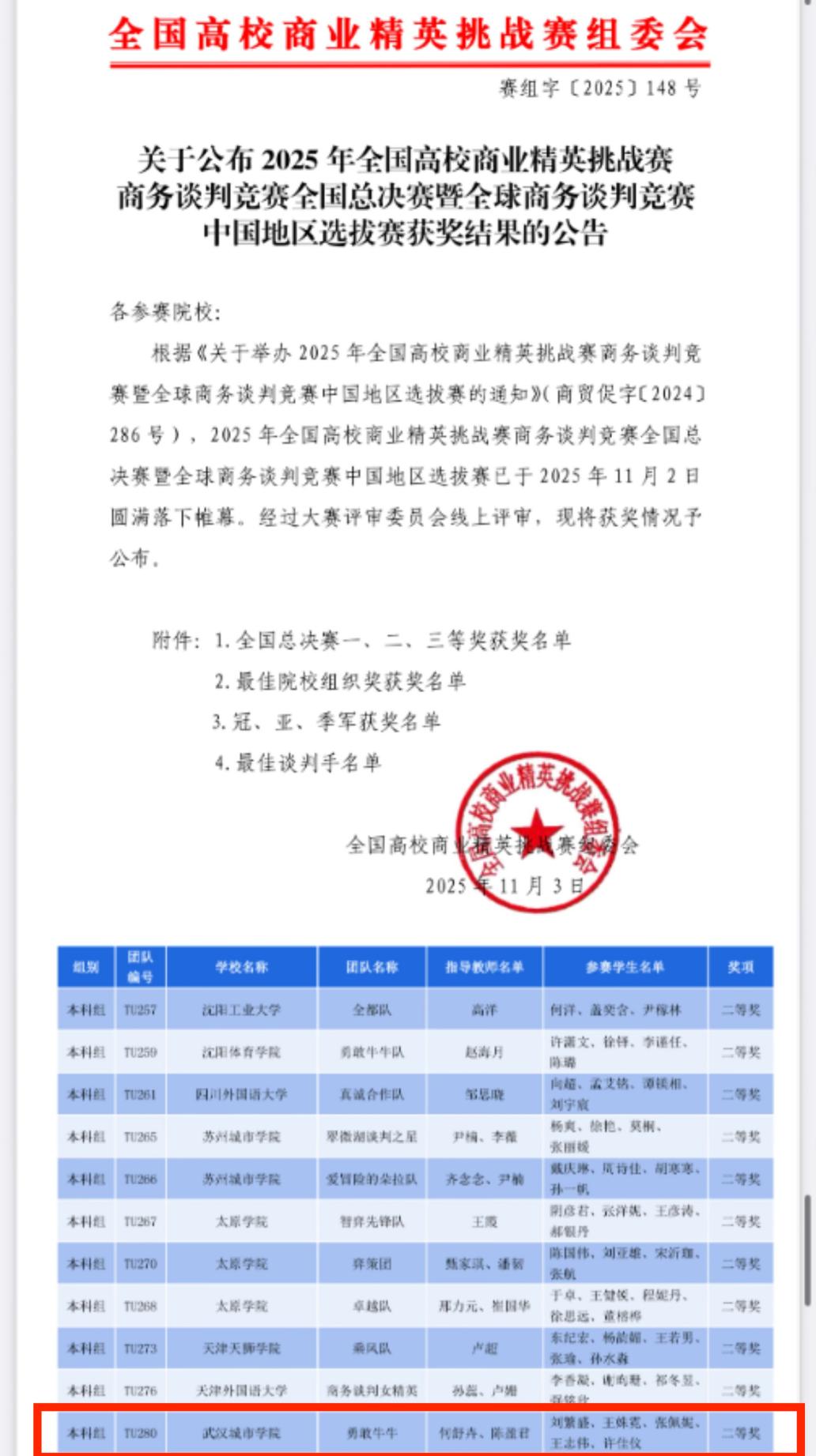 从全校唯一一支通过校赛的团队,到跻身全国舞台,“勇敢牛牛队”用数月的坚持、协作与智慧,展现了当代大学生“敢谈判、会合作、能共赢”的商业素养与青春风采。这份荣誉不仅属于五位队员与指导老师,更是我校经管类创新人才培养成果的生动体现。