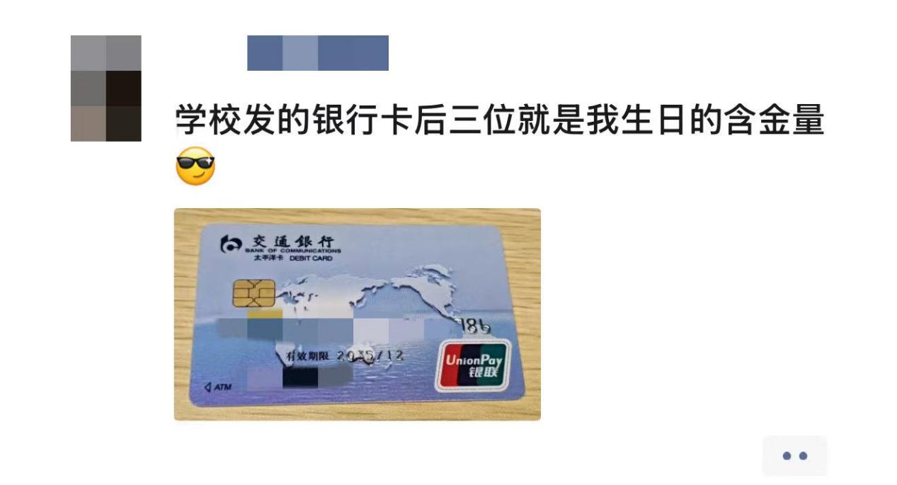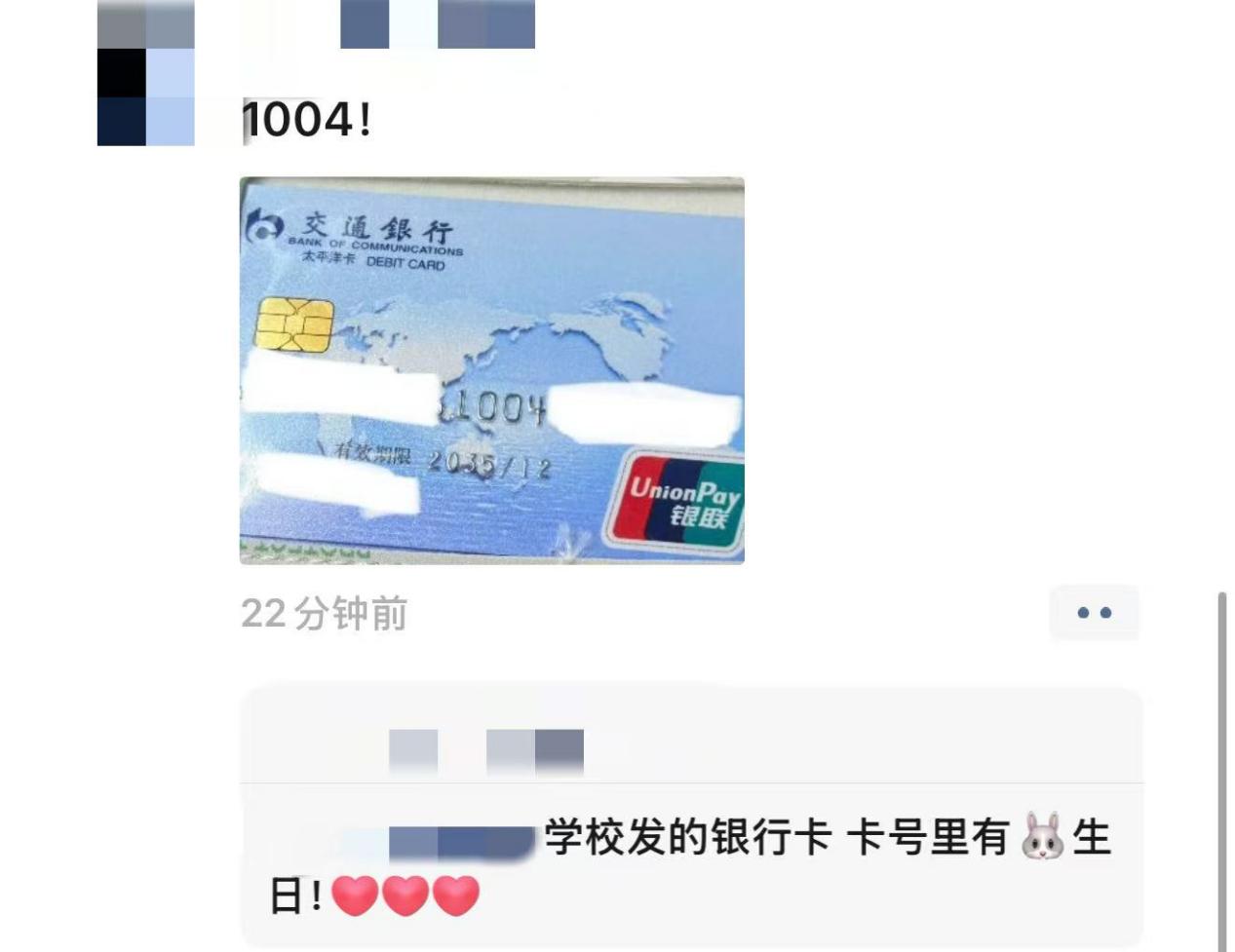 新闻网讯(高级记者 许佳仪 王佳怡 )近日,为帮新生集中激活银行卡,学校安排了银行工作人员驻校。原本是常规的入学流程,却意外掀起一场“晒卡号”热潮。不少同学在完成激活后惊喜发现,自己的银行卡号里藏着专属小幸运——有人撞上了公历生日,有人集齐了偶像的生日数字,这让数字瞬间有了温暖的纪念意义。