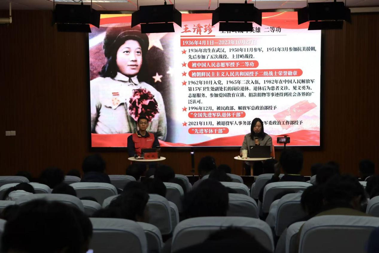 新闻网讯(高级记者 许佳仪 王佳怡)为缅怀革命先烈,传承红色基因,11月27日晚,落雁论坛·新生讲堂如期举行。本次讲座特邀抗美援朝英雄、电影《上甘岭》中女卫生员王兰的原型人物——王清珍女士的孙子刘航先生担任主讲人,为在场新生带来了一场深刻而动人的红色精神洗礼。