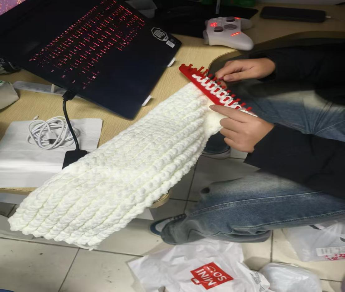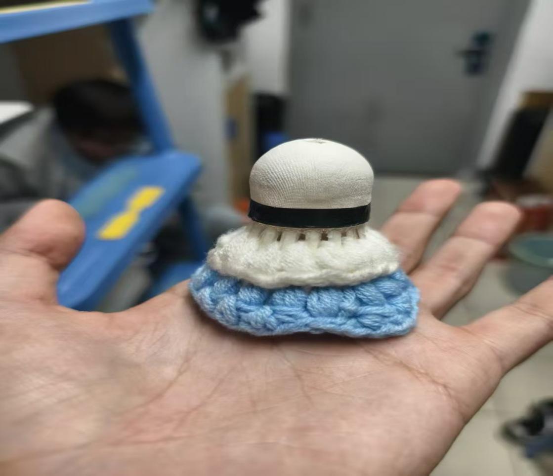 北九433 男生寝室的蓝白渐变羽毛球挂件一经亮相便圈粉无数。为了赶制这批作品,寝室男生们连续熬夜创作,渐变的色彩搭配精巧的造型,完美还原了羽毛球的灵动模样。而隔壁 434 寝室的瞿文浩,更是凭借一手绝活惊艳全场。平日里性格大大咧咧的他,一拿起毛线针就仿佛变了个人,神情专注又细腻。他耗时数日钩织的亚索玩偶堪称 “神还原”:不仅角色轮廓清晰立体,就连亚索标志性的刘海,都用不同色号的毛线层层勾勒,针脚细密匀称、纹路工整利落,一个活灵活现的毛线版游戏英雄就此诞生,引得路过同学纷纷驻足赞叹、拍照打卡。