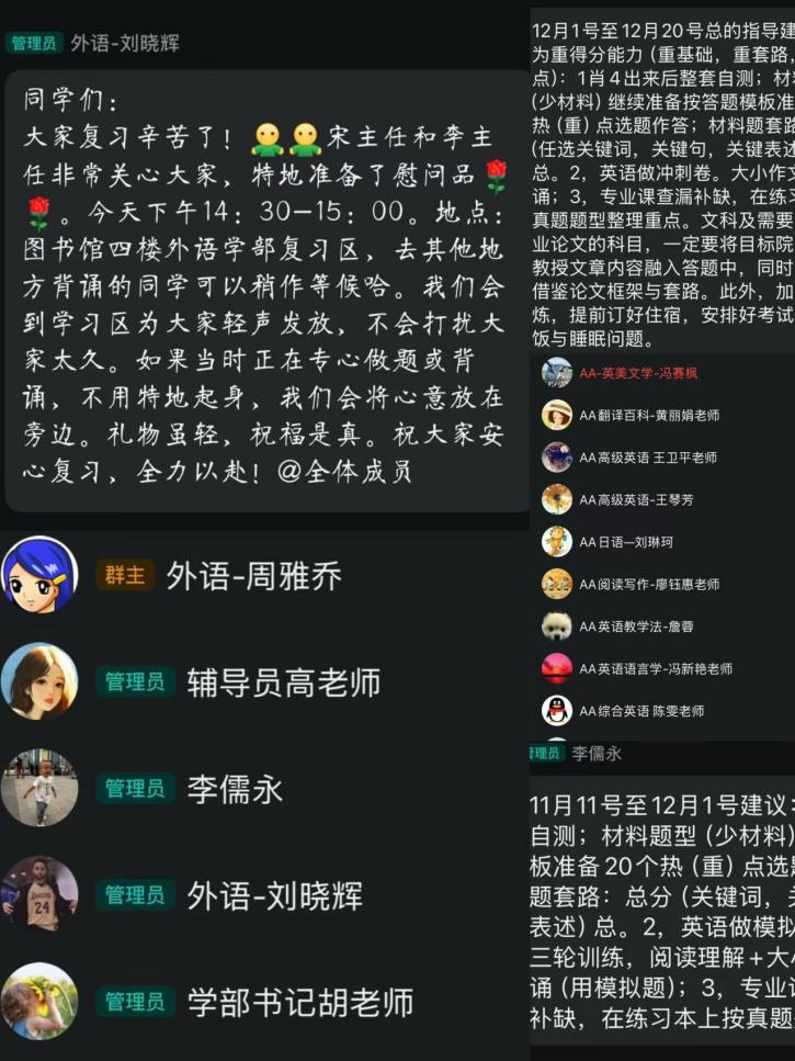24级英语4班的张怡佳同学备考初期曾焦虑困惑,在刘晓辉老师“按照自己节奏来”的建议下逐渐找到状态;英语专业有同学主动充当老师“小助手”,汇报备考情况;国奖获得者占汝杰同学还热情带新老师熟悉图书馆环境……这些点滴互动,让备考之路不再孤单。