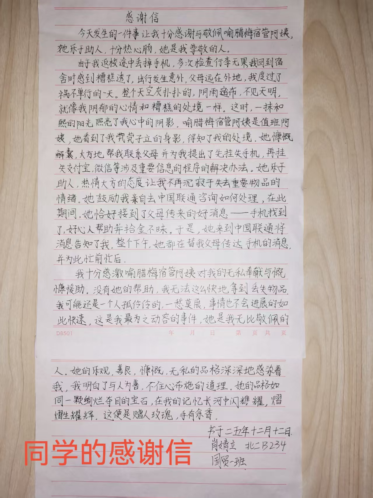 新闻网讯(实习记者王佳怡 许佳仪)“我十分感激喻阿姨,如果没有她的帮助,我真的不知道该怎么办了。”近日,国际贸易一班肖靖立同学将一封亲手书写的感谢信郑重交到宿管喻腊梅阿姨手中。信纸轻薄,情意却深,一则发生在宿舍楼里的暖心故事,悄然映照出后勤服务中那些不为人知的守护。