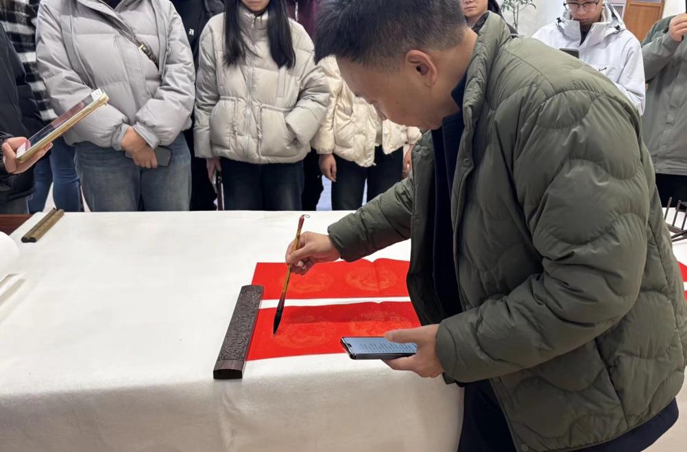 新闻网讯(通讯员 李诗媛 刘雅芳 王志伟) 1 月 11 日,我校墨溢东湖书画社学子在贾涵彬老师的带领下奔赴武汉市江夏区梅南山书院,沉浸式参与湖北省大学生汉字文化周“国际书法作品邀请展”。这场集国际视野与传统底蕴于一体的文化盛会,为青年学子搭建了领略书法艺术魅力、感受中外文化交融的优质平台。