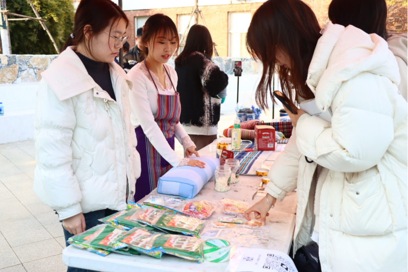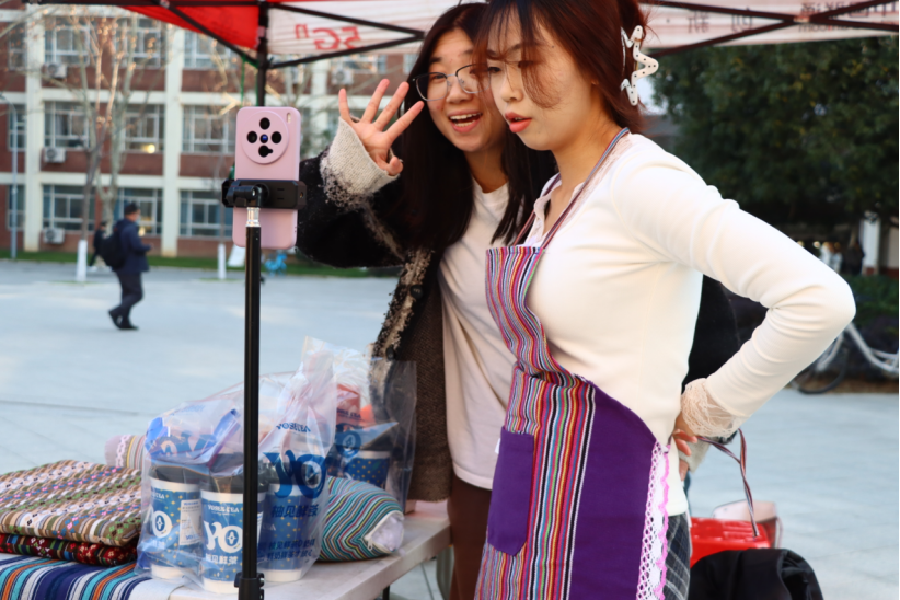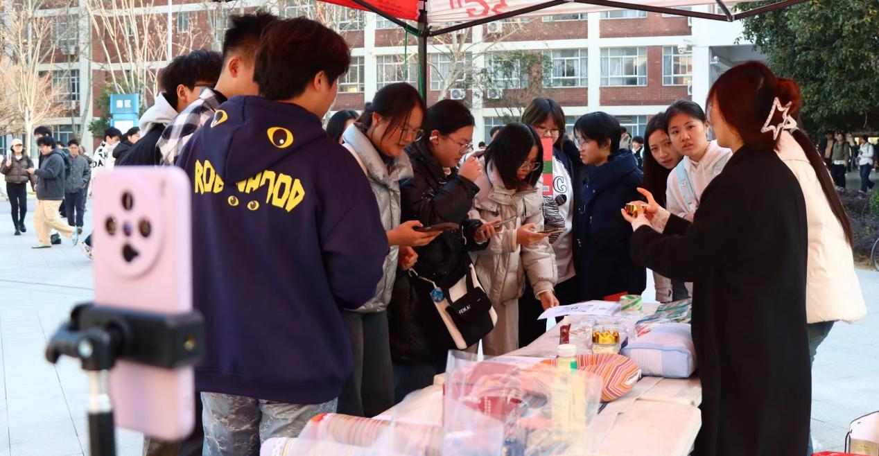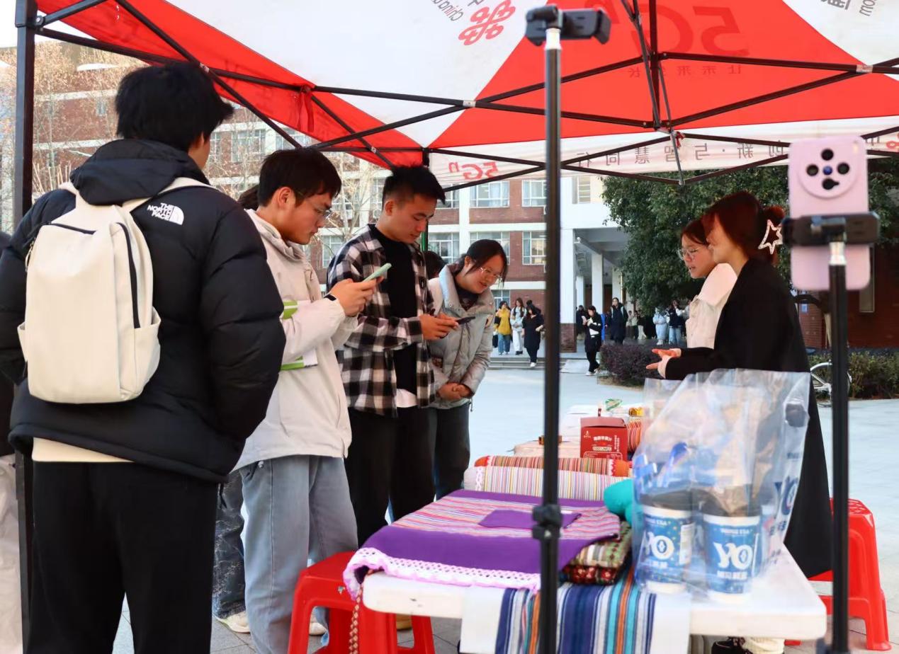 新闻网讯(记者 王伊婷)“亲手触摸非遗红安大布!”“新疆果汁免费尝!”“扫码就送定制好礼!”……1月14日,我校南一教学楼前广场人声鼎沸,一场别开生面的“实战集市”正在火热进行。这不是普通的校园摆摊,是外语学部“云境播探”团队将其三创赛的乡村振兴直播间,从屏幕后搬到了南一广场前,落地为一场“线上直播与线下市集”实时联动的创意实践。