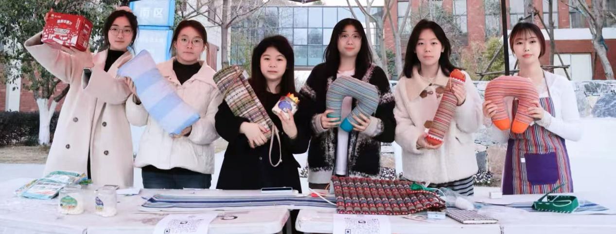 活动现场,来自湖北省红安县的“非遗”明星——红安大布制品格外引人注目。手工编织的坐垫、围巾、围裙、U型枕等产品色泽质朴、触感温厚,承载着传统手工纺织技艺的温度。“我们重点推荐这些乡村助农产品,它们背后是手工艺人的坚守。”来自外语学部的直播组成员杨欣欣一边向线上观众展示,一边向驻足的同学介绍。
