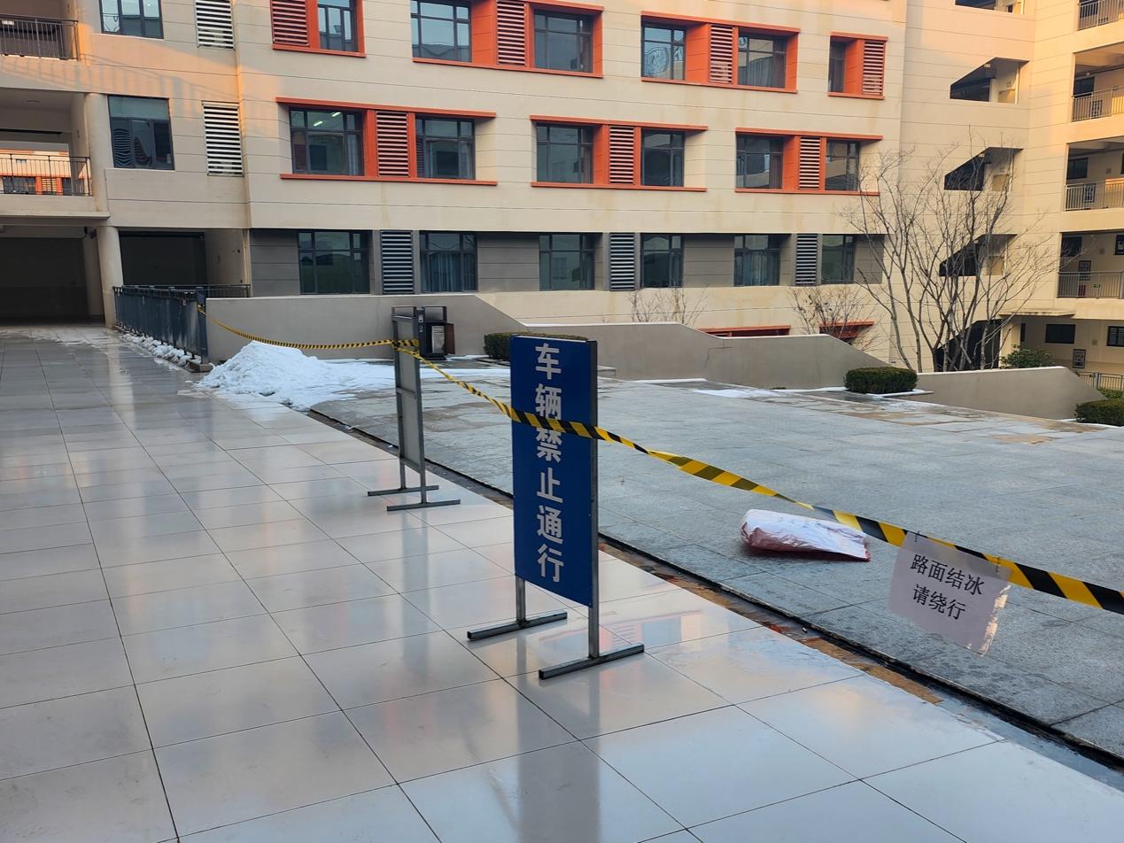 面对冻雨天气,学校后勤部门提前储备足量融雪剂、防滑垫等物资。从1月19日起,每早工作人员就对校内主要道路、台阶、坡道进行除冰防滑作业,确保校园内部通行安全。