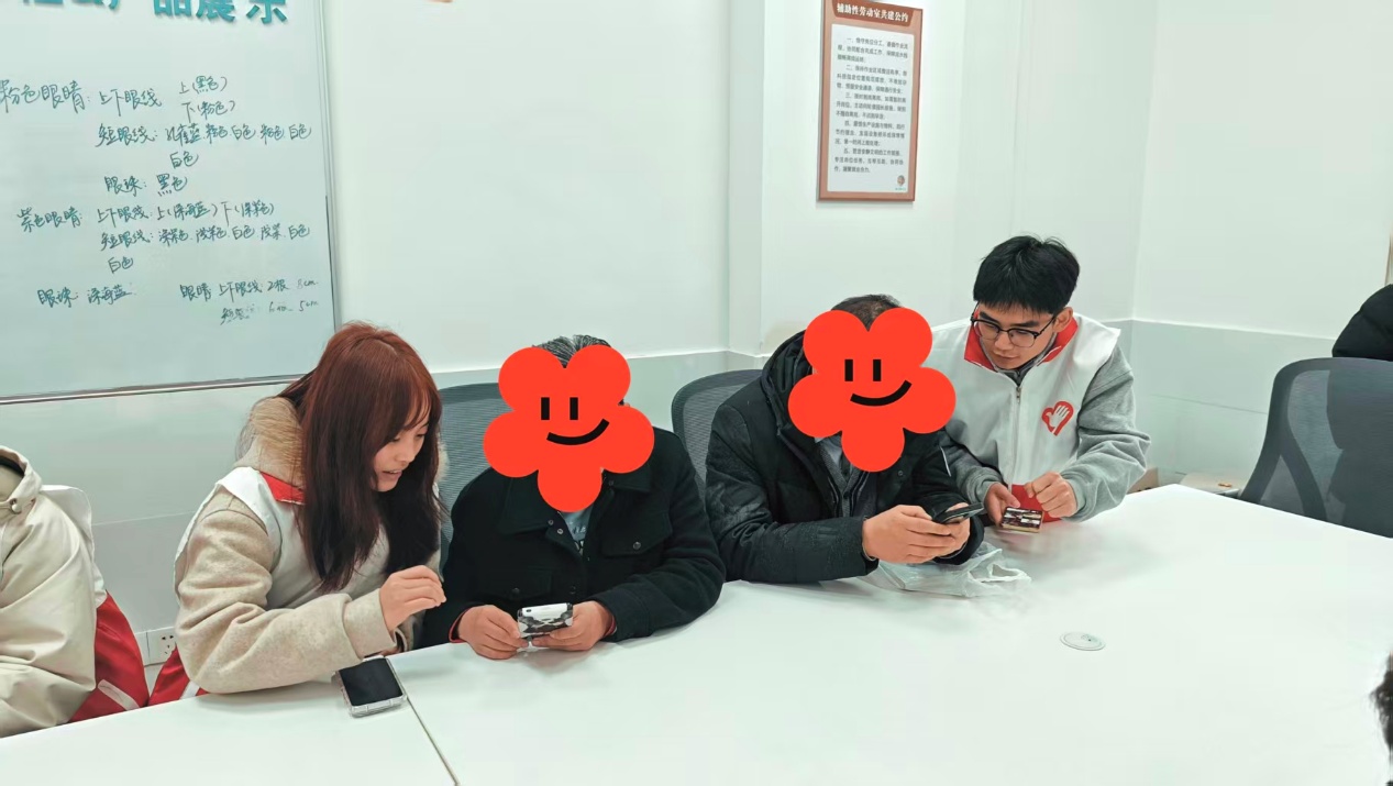 理论课程结束后,活动进入关键的“一对一”帮扶实践环节。我校大学生志愿者们迅速与学员结对,围坐在会议桌旁,耐心细致地开展手把手教学。从教授如何导入素材、进行基础剪辑,到讲解如何添加文字、贴纸、设置动画效果,志愿者们将复杂的操作分解为一个个易懂的步骤。学员们全神贯注,或紧盯手机屏幕尝试操作,或积极提问,现场学习氛围浓厚而温馨。