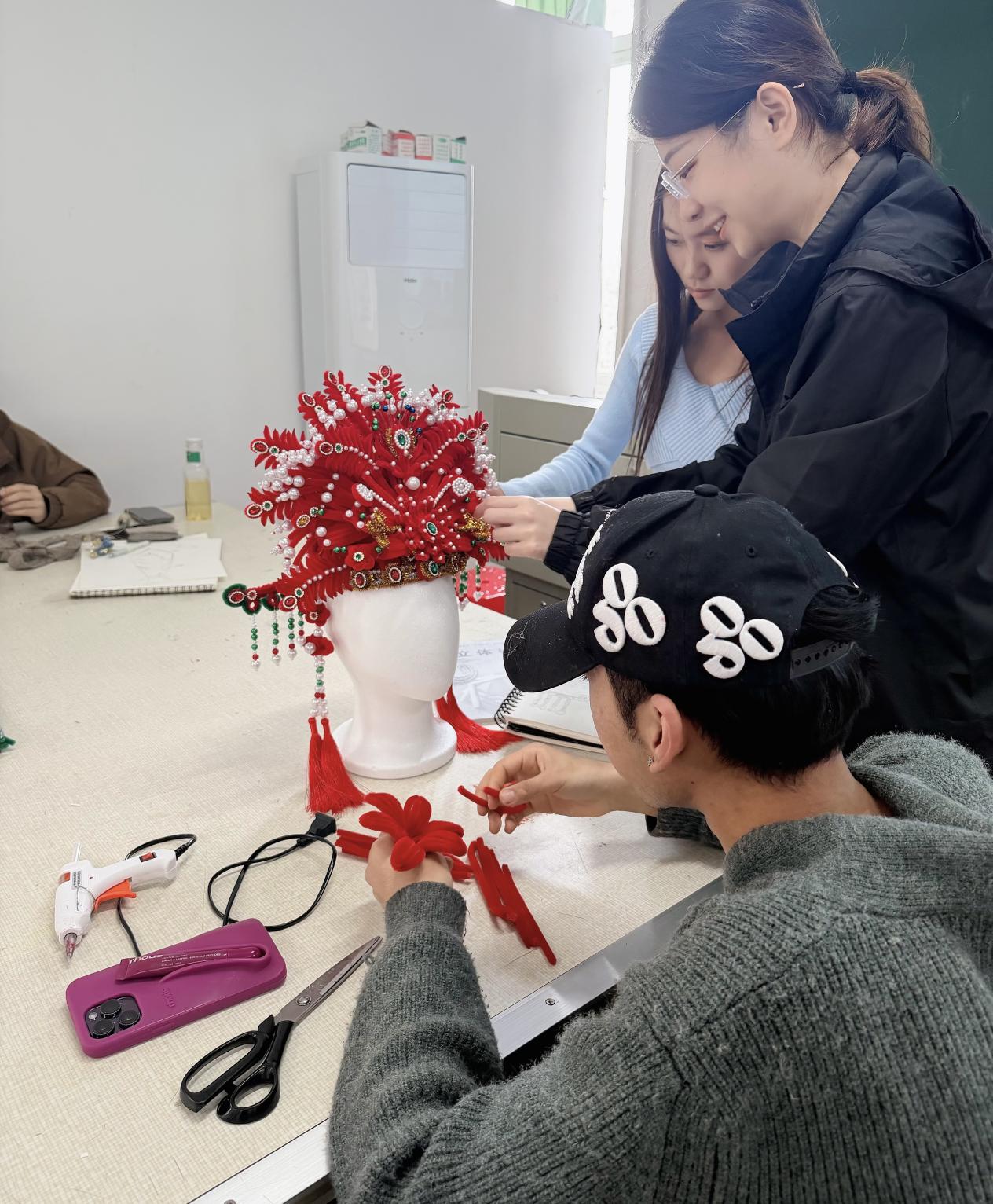 这些平时作业和结课作品整整齐齐地摆在教室后面的展柜里:手工缠花、创意配饰、服装款式设计……路过的人大多只看到“好看”“精致”,却不知道每一件作品背后,都有一段从“想放弃”到“再试一次”的心路历程。