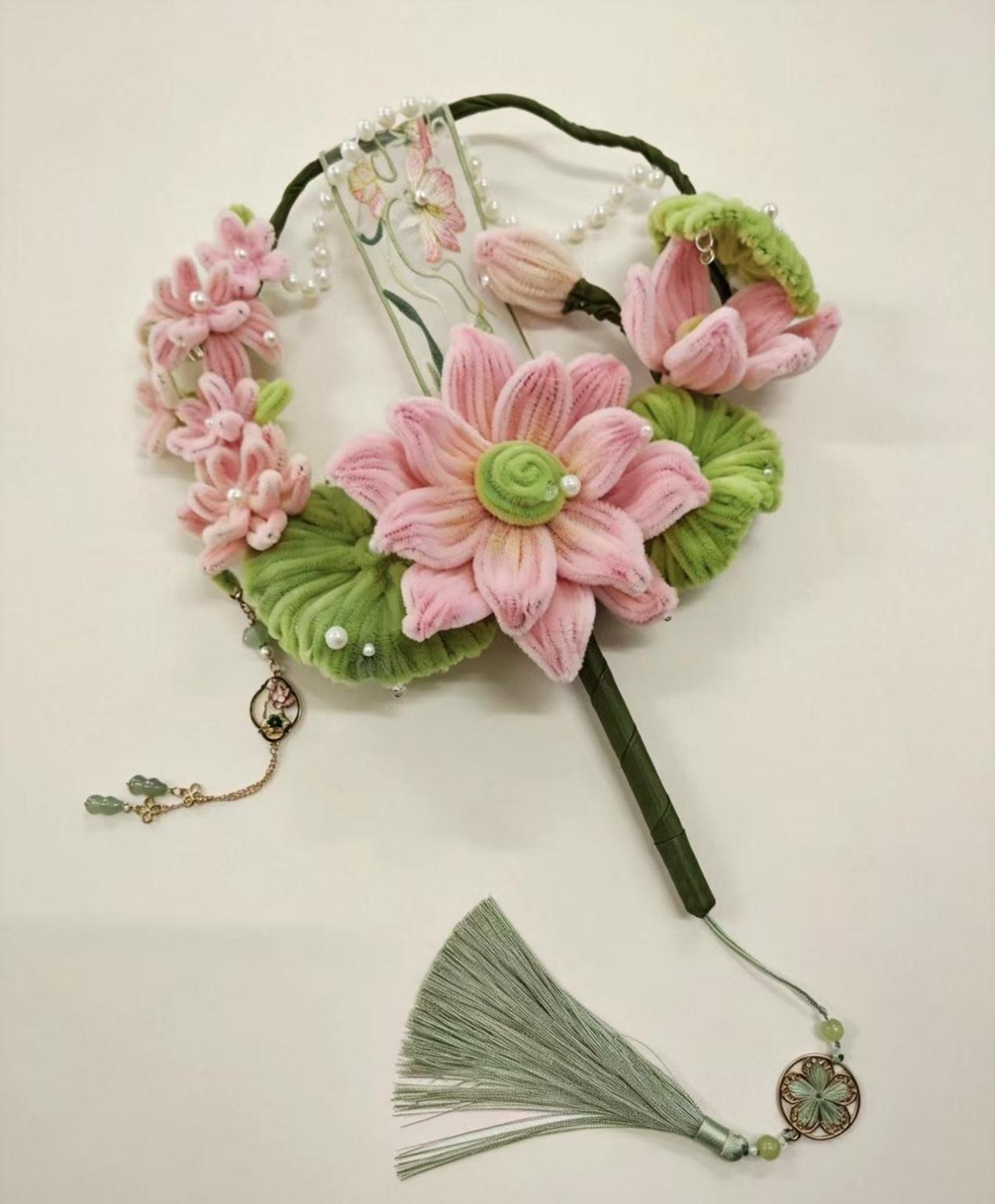 这样的“手把手拯救现场”,在徐老师的课堂上并不稀奇。隔壁桌的陈思雨正在跟一堆彩色扭扭棒“较劲”。她要做一把既有国风韵味又带点童趣的团扇,结果扭扭棒不是固定不住,就是造型突然塌掉。徐老师走过来看了一眼,随手帮她调整了扇面骨架的缠绕方式,并建议她在关键节点加一点隐藏固定的小技巧。慢慢地,花朵立起来了,叶片也有了精神,小珍珠点缀上去的那一刻,整把团扇一下子有了灵魂。