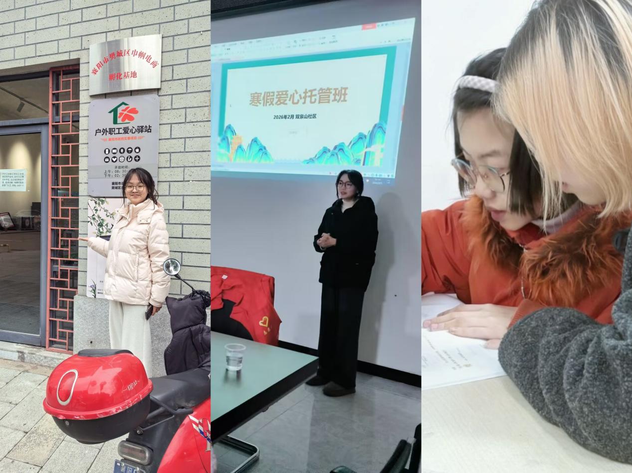 25级视觉传达设计刘书娴、动画班王子颐等学子,分别在社区、乡村开展爱心托管、课业辅导,打造多元课堂,守护童心成长;24级环境艺术设计王涵悦在襄阳社区参与环境整治,设计瓦片画,让艺术美学融入社区文化建设。
