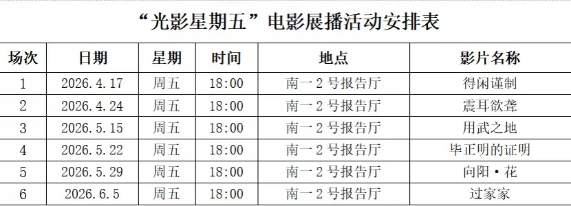 去年,首次举办便广受好评的“光影星期五”,今年将继续为大家带来精神盛宴。即日起至6月5日,每周五晚六点,南一2号报告厅,《震耳欲聋》《用武之地》《毕正明的证明》等正能量影片将陆续展播!