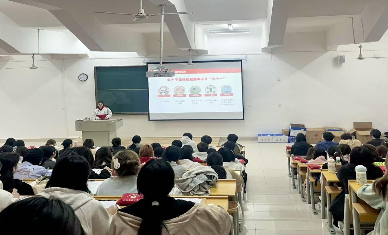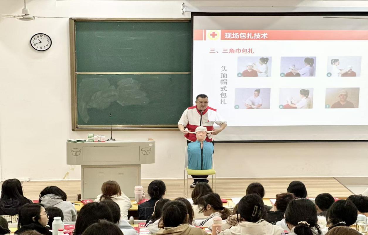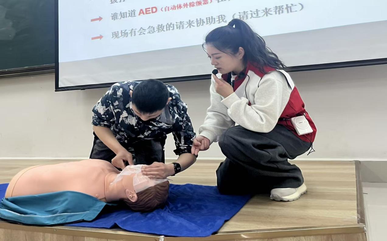 新闻网讯(记者 李睿)“用整个上半身的重量,垂直往下压。”4月20日,一堂让百余名师生手心冒汗又心里有底的急救课在我校开讲。来自红安县红十字会的讲师黄倩、黄栋,带着模拟人、AED训练机和急救包,用“现场讲解+手把手实操”的方式,把心肺复苏、AED使用、海姆立克急救法这些听起来很专业的技能,教得明明白白。