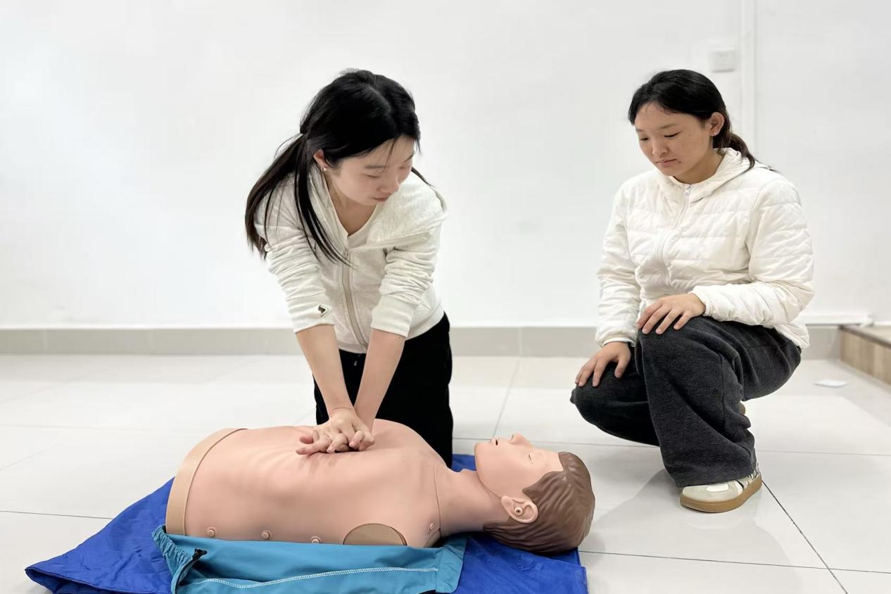 实操环节,学生陈欣雨被点名上台演示心肺复苏。她事后说:“练之前觉得很难,怕自己做错。但跟着老师的口令一步步来,发现是可以做到的。”