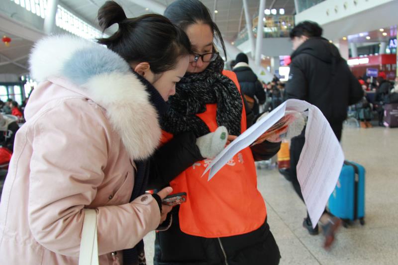 “你好,我的车晚点了!改签去哪里呀?”“您改签可以去2号售票厅,出门左拐,您跟我来……” 1月1日,在武汉火车站,武科大城市学院青马晨曦志愿者们用他们的热心服务温暖寒风中出行的人们。
