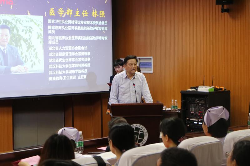 医学部主任林强发表讲话。“有一种职业,没有经历过就不明白它的艰辛。有一种艰辛,没有体会过就不明白它的快乐。有一种快乐,没有品尝过就不明白它的滋味。这就是护士,阳光下最平凡、最平淡、最单调的职业。” 林强表示,医学部要以“创一流业绩,行精湛服务,树行业口碑”为目标,在接下来的工作中再创佳绩,并希望同学们不断吸收新知识,不断跟进新技术,努力提高自己的业务知识和技术水平,用爱心、真心、责任心拥抱工作。