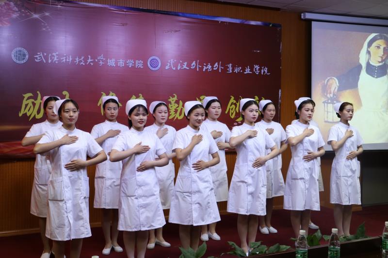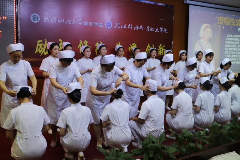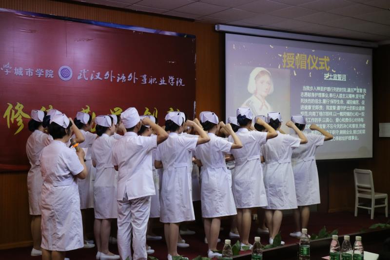 表彰会上,还举行了庄重而神圣的授帽仪式。原三甲医院护理部主任李美德、辛玲芳,老护士长梅国书、常艳明、彭虹、龚斌,教师吴琼、廖辉为准白衣天使们戴上洁白的燕帽。老师李美德带领全体护理专业学生宣誓。