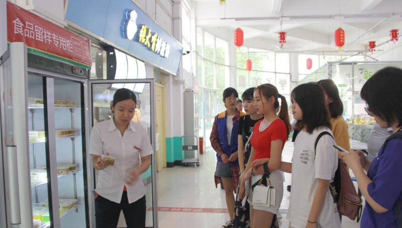 学生代表们在食堂负责人徐清霞带领下,首先了解了食堂经营方式、经营范围、经营运行等方面的情况,随后参观了食堂一、二楼的物料仓储区、后厨区、消毒区、用餐窗口区等区域。在参观过程中,徐清霞对学生们提出的问题一一解答。在物料仓储区,徐清霞向学生们展示了大米、食用油、面粉、调料包等,并详细介绍了这些食材的产地、保质期。在后厨区,学生代表们了解到每位工作人员上岗前必须持有健康证并做定期检查,还查看了记录各种日常分类的报表。