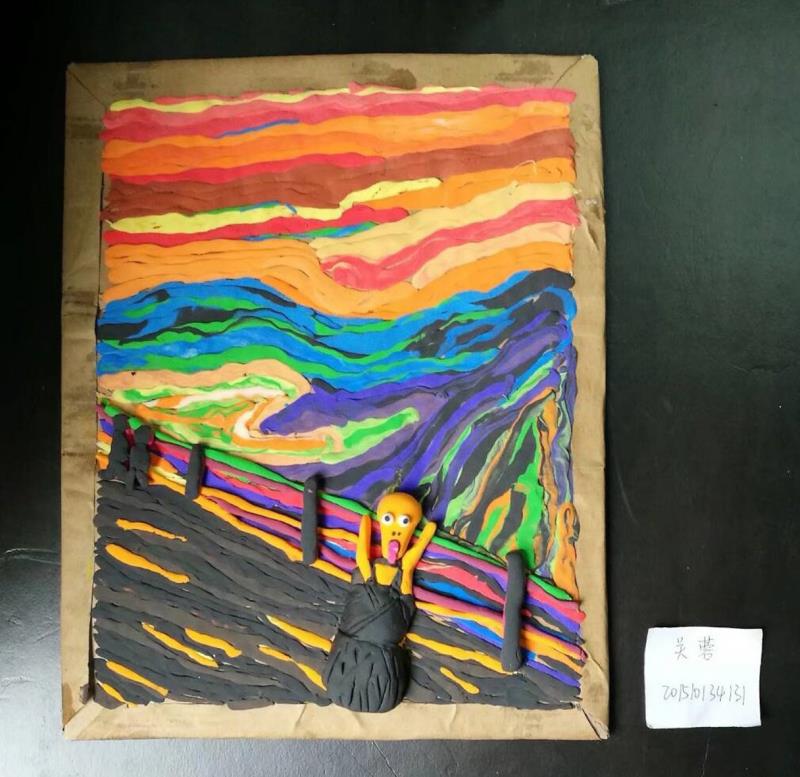 课堂上,同学们用不同的材质创造各种憨态可掬的动画角色、小动物、挂画等。展示的作品中,有轻粘土版的《尖叫》、《星空》;软陶制成的可爱的小黄人、小羊肖恩、海绵宝宝;油陶制成的小卫……引起了同学们广泛兴趣。设计了作品《呐喊》、《披纱美人》的15级动画专业1班学生关蓉说:“我觉得过程很有趣,完成一个作品一般需要一个上午,甚至一整天,从具体的实物中了解抽象的结构,还可以学到人体结构、材料性质、颜色搭配、调色等方面的知识,感觉非常的充实。”