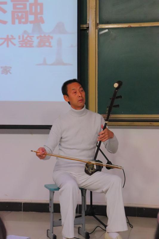 新闻网讯(通讯员刘小雪 摄影邹昊廷)11月25日18:00,院团委特邀国家一级演奏员车定祥在学院南一报告厅作《 情感与心灵交融——胡琴音乐艺术鉴赏 》主题讲座。200名艺术团学生在悠扬的琴声中了解中国传统文化,体会胡琴音乐的美妙。